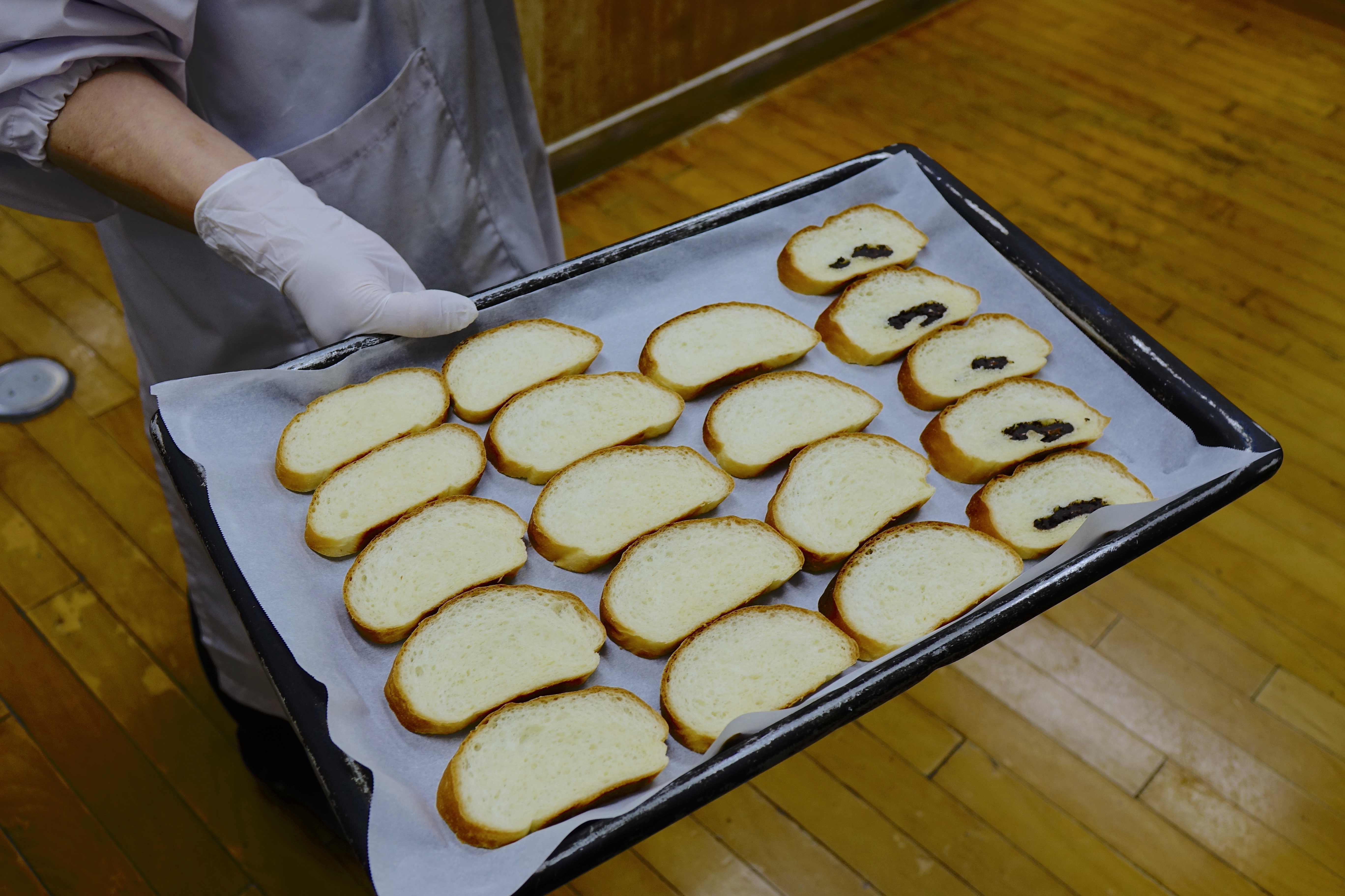 4月の平日のお昼過ぎにワークセンターはばたきの工房(調理室)を覗かせてもらうと、調理服、調理帽、調理靴、手袋、マスクを身にまとった3人の障がい者の方たちが、ラスクを作っていた。