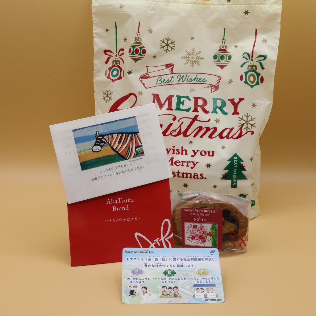 板橋区の地域住民の皆さまに楽しんでいただく、(株)トプコンの毎年恒例のクリスマスイルミネーション。今年も、来場者へのプレゼントに、本社が板橋区にあるということからsweet heart projectのお菓子を選んでいただきました。ラスクで人気の板橋の赤塚福祉園さんです。