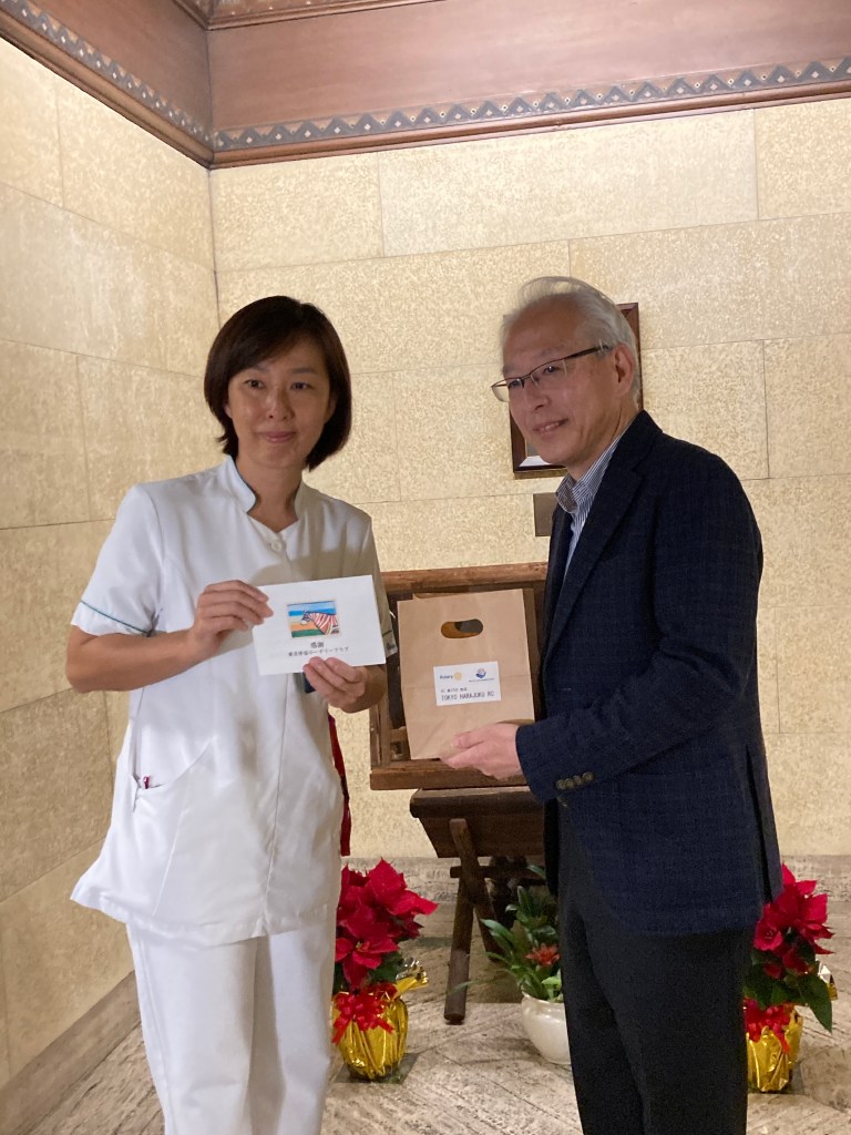 原宿ロータリークラブが、コロナ禍で奮闘されている聖路加国際病院の医療スタッフの皆さまへ、感謝と敬意を表して、2021年12月にクリスマスプレゼントを贈られました。そのプレゼントにsweet heart projectのお菓子を選んでいただきました。ストロベリー焼きドーナツ(喫茶アラジン@東京都中央区)、ブールドネージュ(調布を耕す会@東京都調布市)、キャラメルクッキー(飯田川つくし苑@秋田県潟上市)をセットにしてお作りしました。