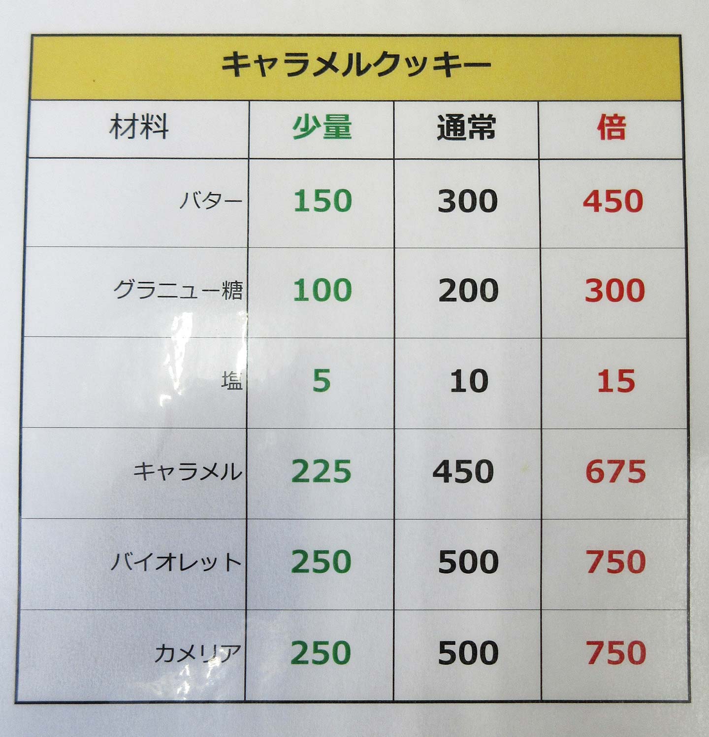 そうした“作業しやすい環境”づくりがさまざまなパートで導入されている同事業所。その工夫のひとつに、クッキーの製造量ごとに色分けされた材料分量表があります。