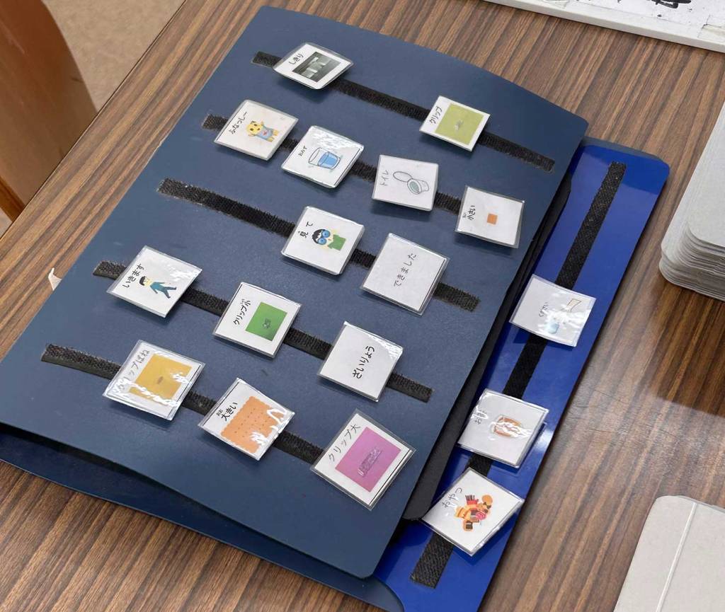 「そこにある色鉛筆でやむなく描いてはったので、全体的に暗い色味になってしまっていたようです。それが、PECS®(ペクス)という絵カードを使うコミュニケーションシステムを導入してから「ピンク、色鉛筆、ください」など、色を指定してくるようになって。それ以来、彼女の作品は全体的に明るい色になったんです。ツールを取り入れたことで、本当に描きたいものが描けるようになったというのは、私たちにとっても大きな気づきでした」