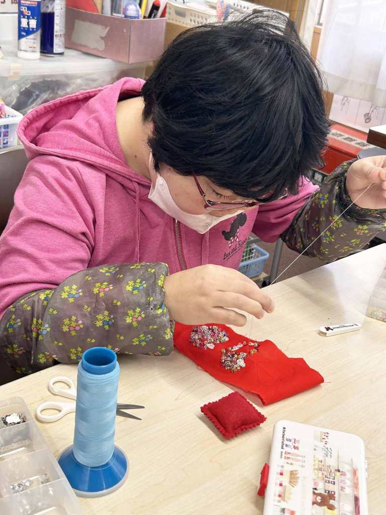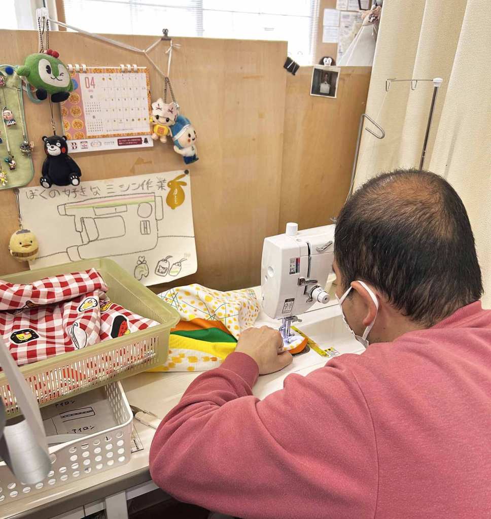 この巾着の制作においては、就労B型だけでなく、生活介護のメンバーも作業に加わっているのだとか。布の裁断、ミシンでの縫製、紐通し、紐のカット、紐を結ぶなど、作業を細分化することで、多くのメンバーがなにかしらの工程で参加することができます。